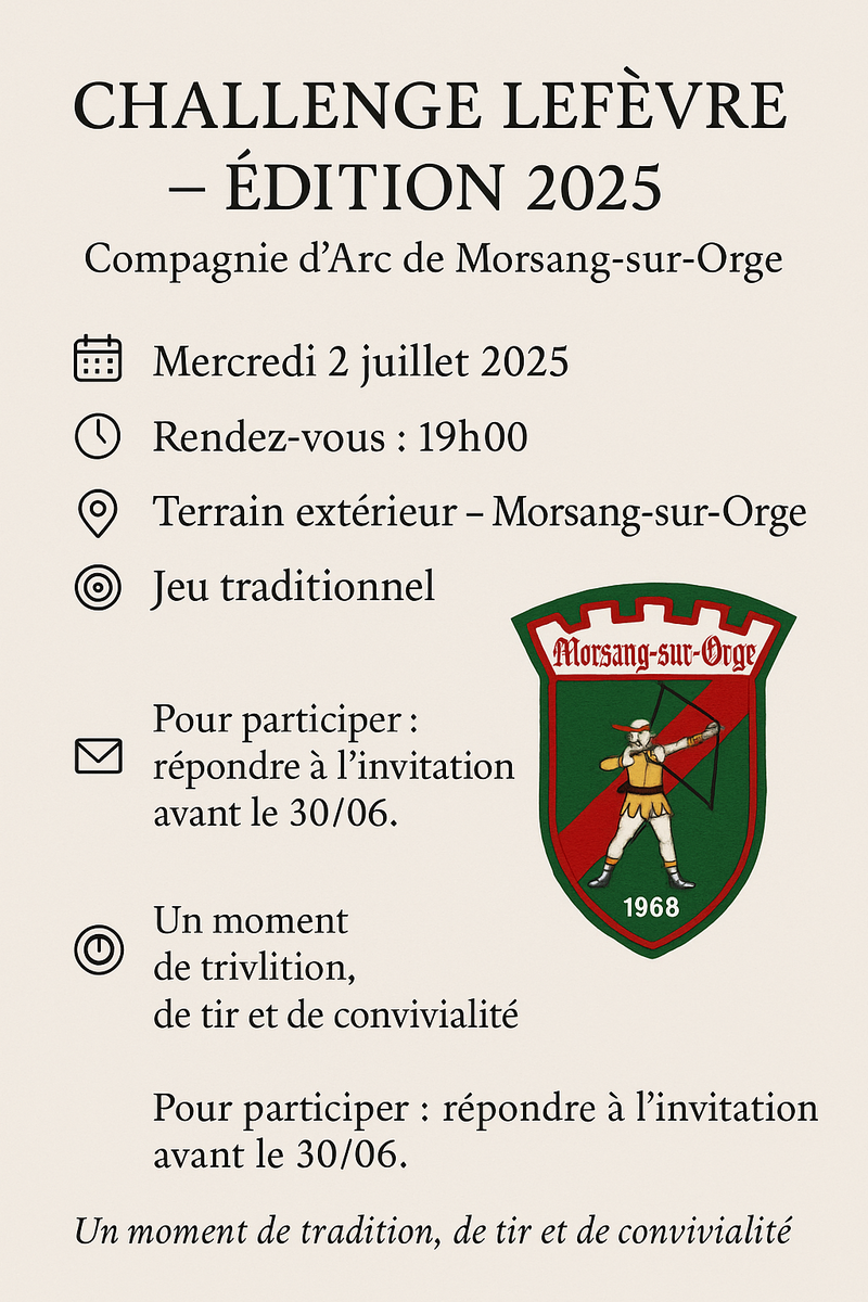 À cette occasion, la Compagnie d’Arc de Morsang a le plaisir de vous convier à son jeu annuel: le Challenge Lefèvre – Édition 2025.